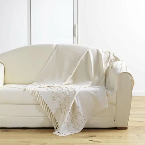 Plaid en coton Dimension : 125 x 150 cm Matière : 100 % coton (380 gr/m² Couleur : beige et or Finition : plaid à franges. Lavage à la main