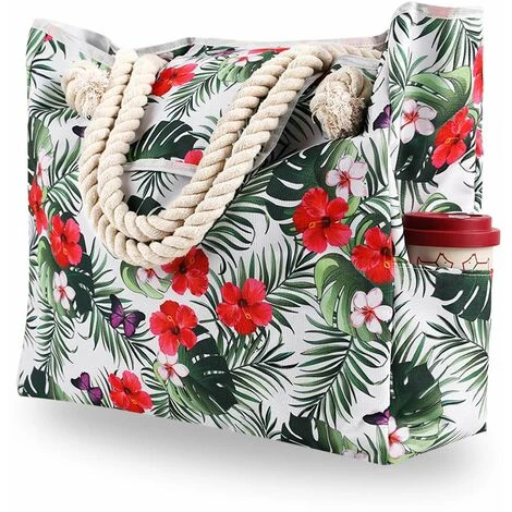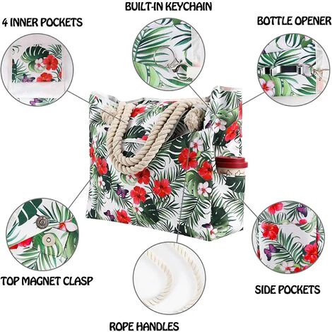 AIDUCHO Sac De Plage Extra Large Pour Femme, Fourre-tout En Toile Surdimensionné Imperméable Et Résistant Au Sable Avec Poches Pour Gym, Yoga, Piscine, Accessoires Essentiels De Voyage En Famille, Fournitures De Vacances, Feuilles De Fleurs Florales