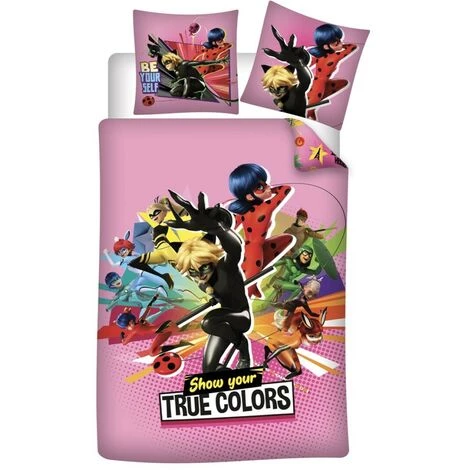 Le parure de lit révèle les personnages de Miraculous et plus précisement « Show Your True Colors ». « Montrez vos vraies couleurs » Les personnages principaux de Miraculous tels que Ladybug sont positionnés au premier plan sur toute la partie centrale de la parure de lit, avec l’inscription « Show Your True Colors ». De l’autre côté, sur le côté réversible, on retrouve des motifs, logos, inscriptions et autres éléments à de nombreuses reprises qui illustrent parfaitement cet univers Miraculous.