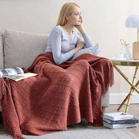 Jeté pour canapé, 50 x 60 rouille, couverture d’été tissée en tricot acrylique, jeté de sieste doux et décoratif léger avec gland pour chaise-lit canapé pique-nique de voyage, adapté à toutes les saisons
