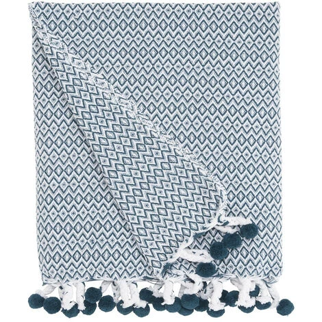 Notre plaid Holi bleu avec des motifs brodés blancs offrira à votre fauteuil, canapé ou lit, une touche en plus qui réveillera votre décoration. Ce plaid avec ses motifs graphiques et ses pompons donnera du relief à votre intérieur.