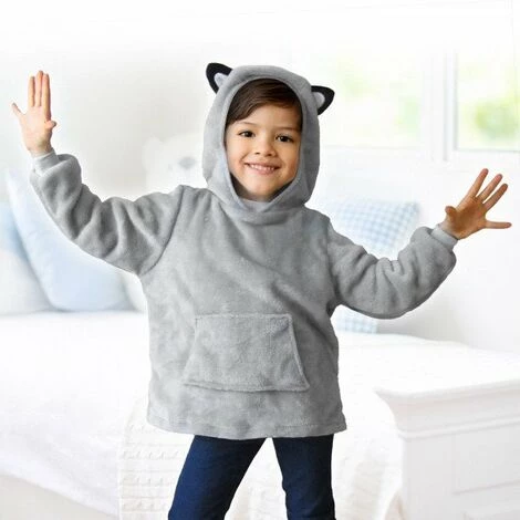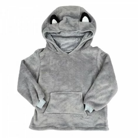 Finition : plaid à capuche avec oreilles, manches et 1 poche sur le ventre. Se replie en forme de peluche.