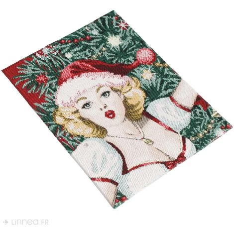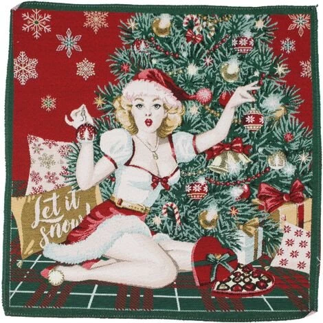 Tissu carré jacquard tissé teint avec un motif festif mettant en scène une mère noël décalé devant un sapin de noël sur fond dominante couleur rouge et vert.