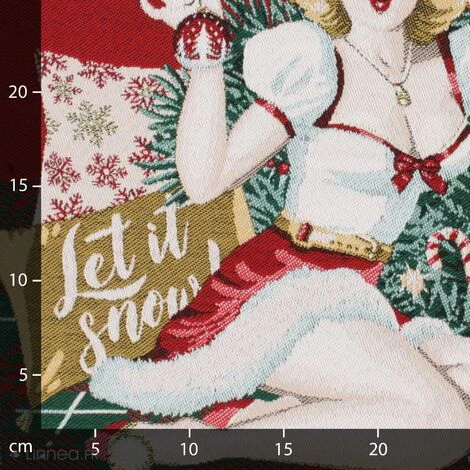 Tissu d’ameublement composition 78% polyester 22% coton, dimension 47×47 cm avec un motif festif esprit noël et un fond dominant rouge.
