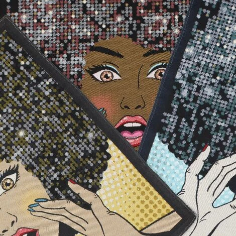 Tissu carré jacquard tissé teint avec un motif d’une chanteuse disco version pop à paillettes dominante couleur bleu.