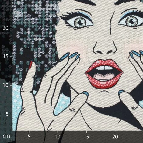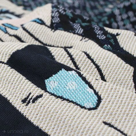 Tissu d’ameublement composition 77% polyester 23% coton, dimension 47×47 cm avec un motif personnage et un fond dominant bleu.