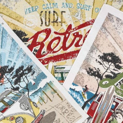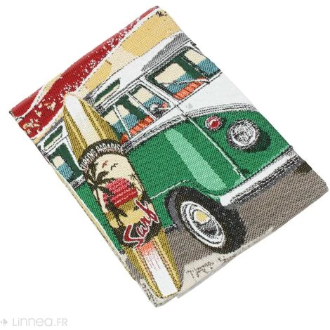 Tissu carré jacquard tissé teint avec un motif combi volkswagen, surf, plage au look retro dans des tons vert.