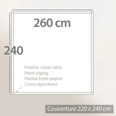 Disponible dans les tailles 180x220cm, 220x240cm, 240x260cm et 240x300cm et décliné dans 7 coloris en bi-couleurs (une face claire et une face foncée sauf coloris blanc naturel avec deux faces identiques).