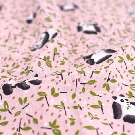Tissu d’ameublement composition 100% coton percale, dimension Laize 150 cm avec un motif panda et un fond dominant rose.