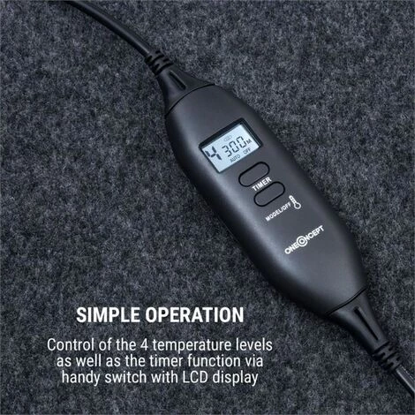 Avec ses 100 watts, le Magic Carpet DLX vous garantit d’avoir les pieds au chaud à tout moment dans votre salon, votre bureau, votre salle de jeux, votre atelier ou même votre caravane. Le tapis chauffant se contrôle par un interrupteur pratique avec écran LCD. Vous pouvez donc régler très facilement les 4 niveaux de température ainsi que la minuterie pratique avec 7 temps d’arrêt au choix. La surface du tapis garantit une douceur maximum, mais elle est aussi très robuste et résistante. Les petits picots au dos l’empêchent de glisser sur les sols lisses. Grâce à la prise pratique sur le bord du tapis, l’élégant tapis chauffant se débranche facilement de l’alimentation électrique pour un nettoyage facile – le secouage et le nettoyage en profondeur sont un jeu d’enfant. Avec sa teinte anthracite neutre, le tapis chauffant s’intègre visuellement dans n’importe quel style d’intérieur ou de bureau. La chaleur est libérée après une courte période de chauffage et économise de l’énergie.