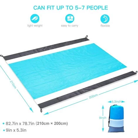 Emballé inclus – Livré avec 1 tapis de plage, 4 ongles fixes, 1 mousqueton, 1 sac de transport.