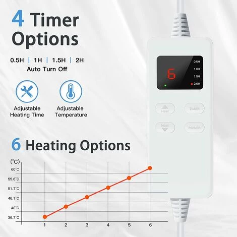 Arrêt Automatique et 6 Réglages de Température : Vous pouvez régler le minuteur sur 30, 60, 90 ou 120 minutes. Lorsque le temps est écoulé, l’chauffant Électrique dos s’éteint automatiquement. Des fiches mal fixées, des coussins chauffants endommagés, des températures élevées déclenchent la protection de sécurité et l’couverture chauffante arrête de chauffer. 6 niveaux de chauffage, 36,7°C- 40°C – 46,1°C- 51,7°C – 55,6°C-60°C.