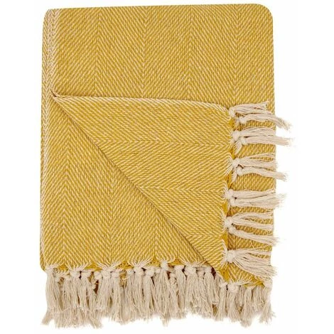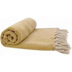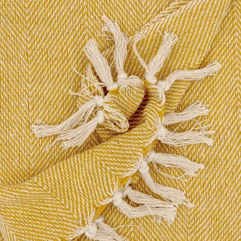 Fouta, jeté de lit, plaid 100% coton 120 x 150 cm avec franges jacquard motif chevrons bicolore jaune. Une fouta au tissage travaillé et dont la couleur sera parfaite pour les soirées d’été.