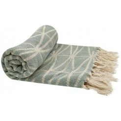 Fouta, jeté de lit, plaid 100% coton 120 x 150 cm avec franges jacquard motif géométrique bleu. Que ce soit pour s’asseoir dans le sable ou la porter comme paréo pendant les beaux jours, cette fouta 100% coton ne vous quittera plus.