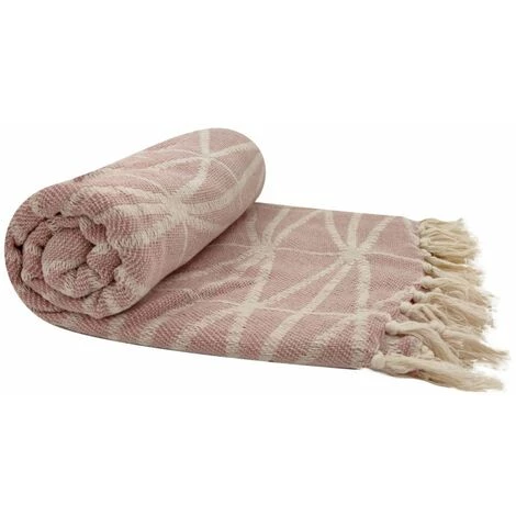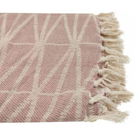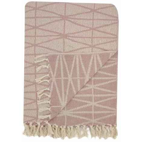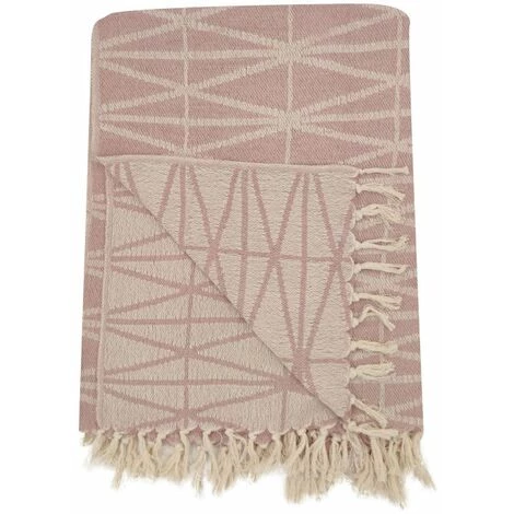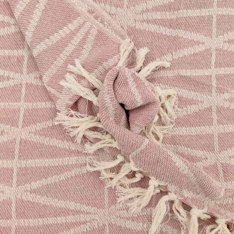 Fouta, jeté de lit, plaid 100% coton 120 x 150 cm avec franges jacquard motif géométrique rose. Une fouta à la couleur douce et cosy qui vous suivra partout cet été.